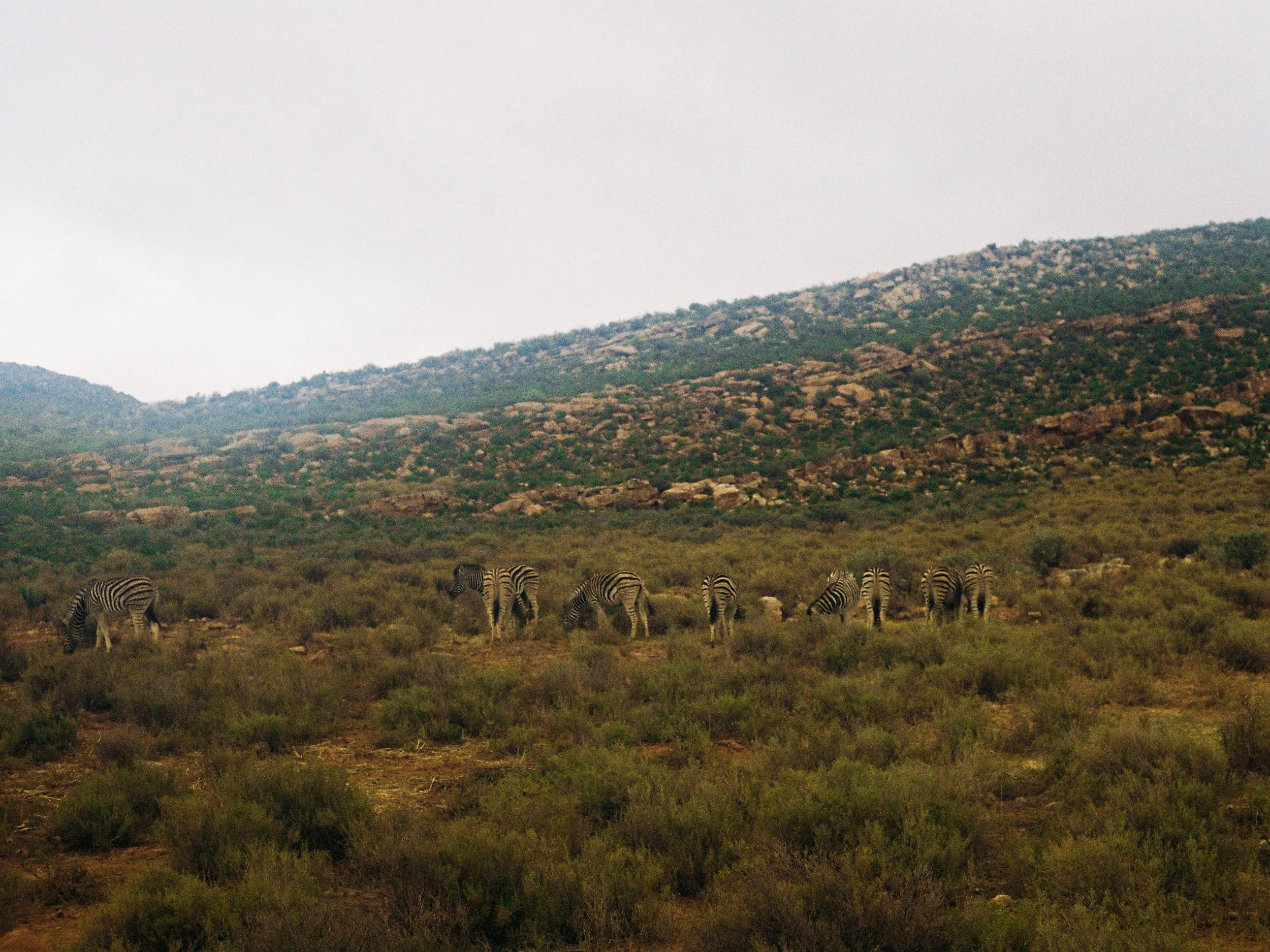 A group of zebras grazing on desert vegetation in a landscape with green hills and rocky terrain under an overcast sky.
