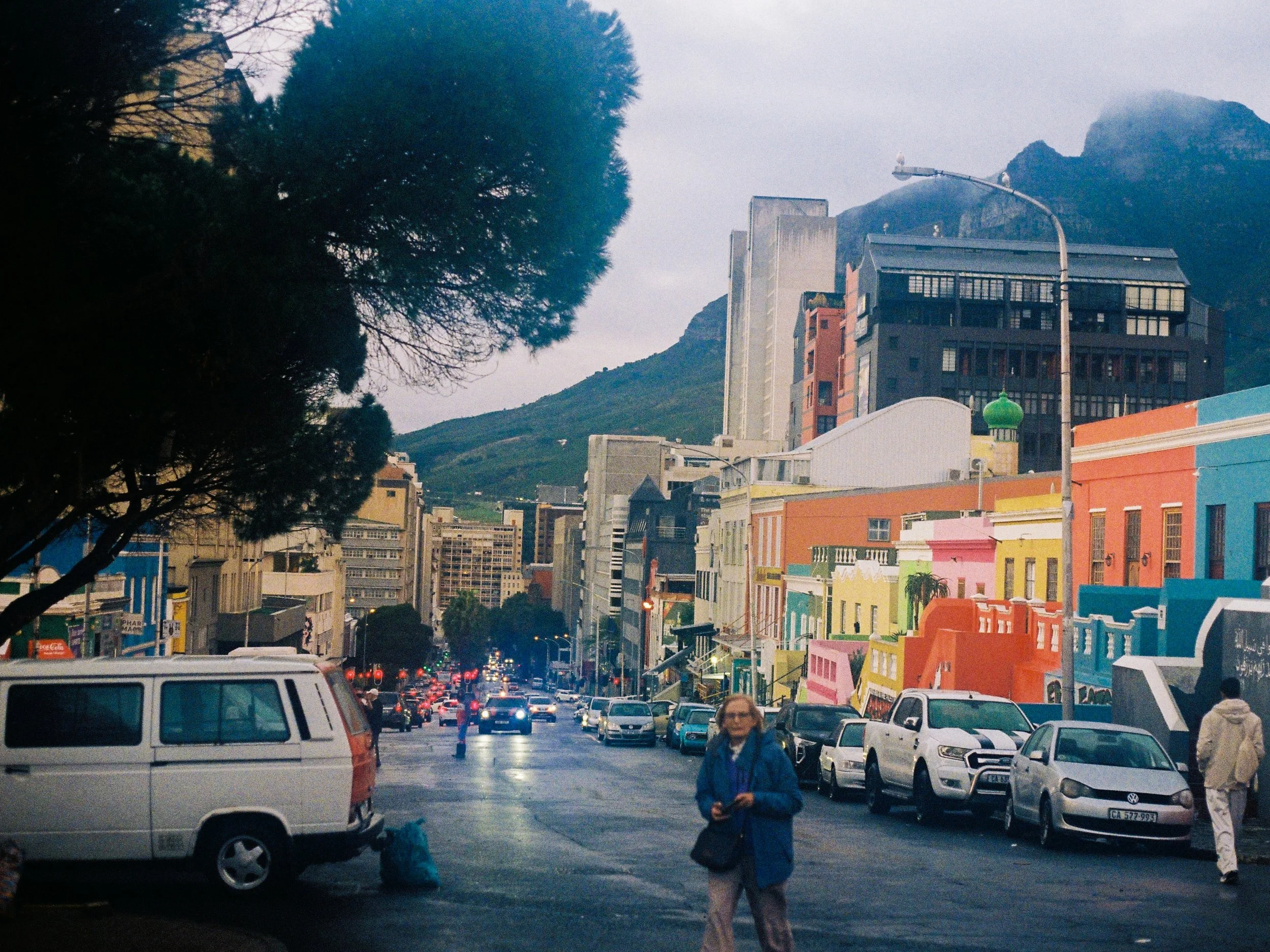 City street view with colorful buildings on the right, cars parked along the sidewalk, and a mountain backdrop. People walking, including a woman in the foreground wearing a blue jacket.