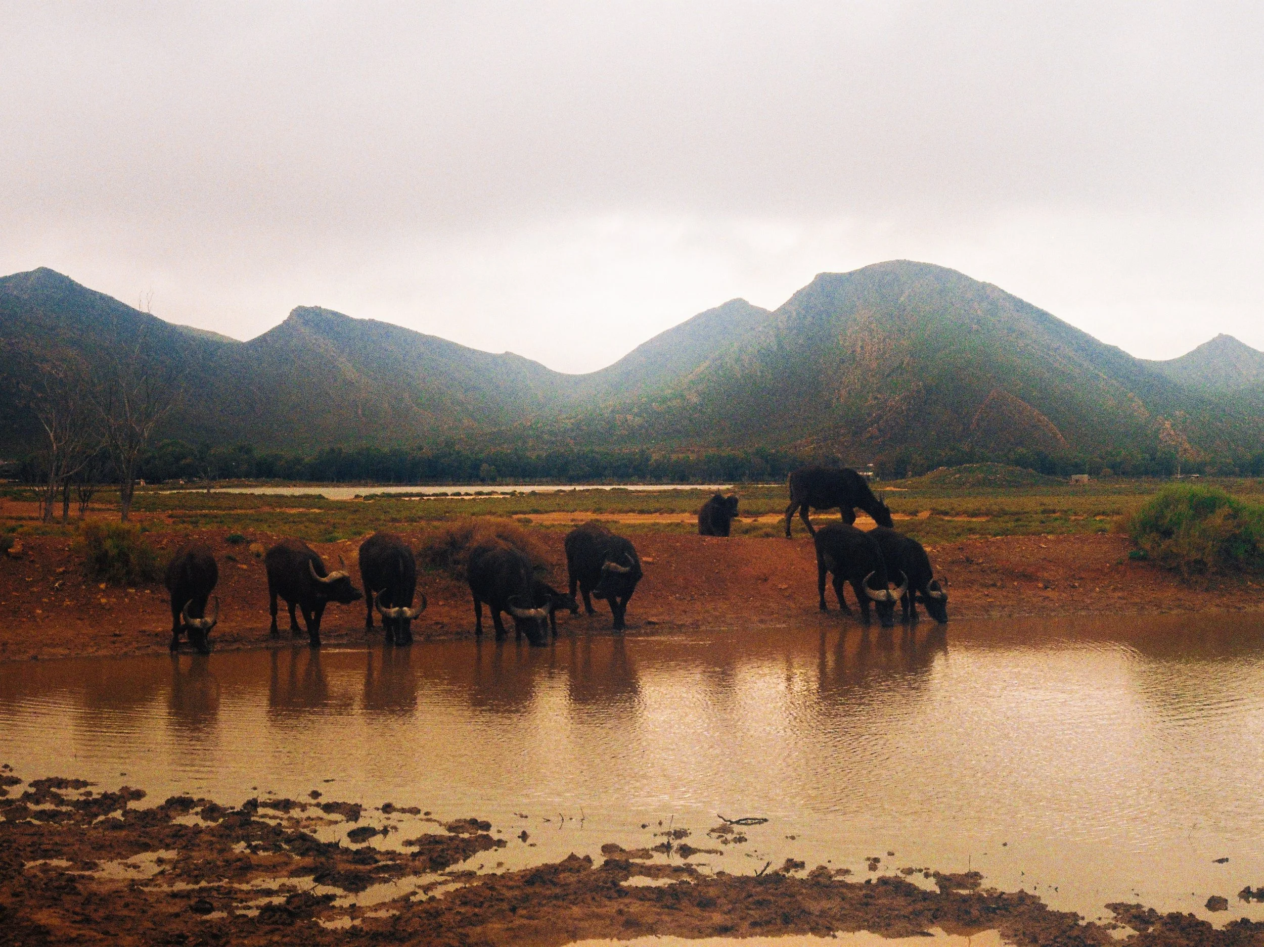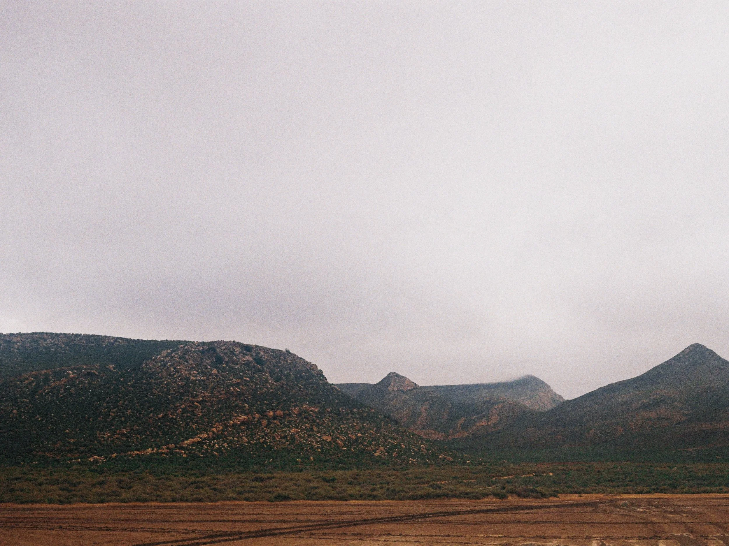 Landscape with mountains, overcast sky, and dry, reddish-brown land in foreground