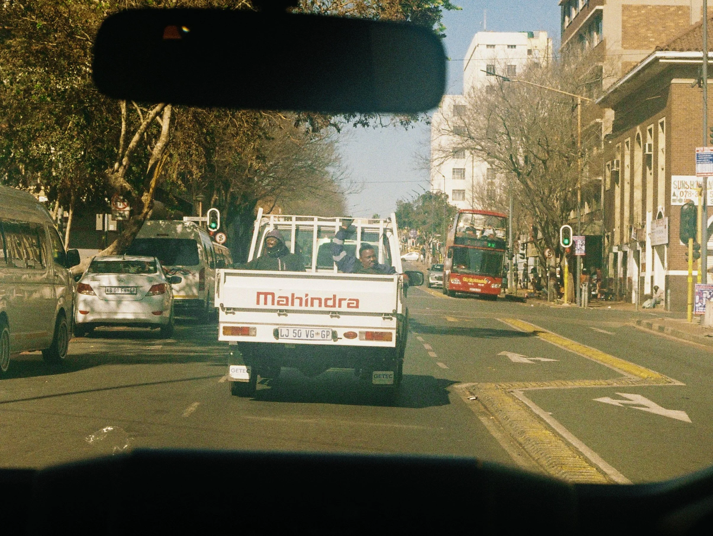 Urban street scene viewed from inside a vehicle, showing a Mahindra pickup truck with three men riding in the back, cars parked along the side of the street, and a red bus turning. Trees and buildings line the street with traffic lights and pedestria