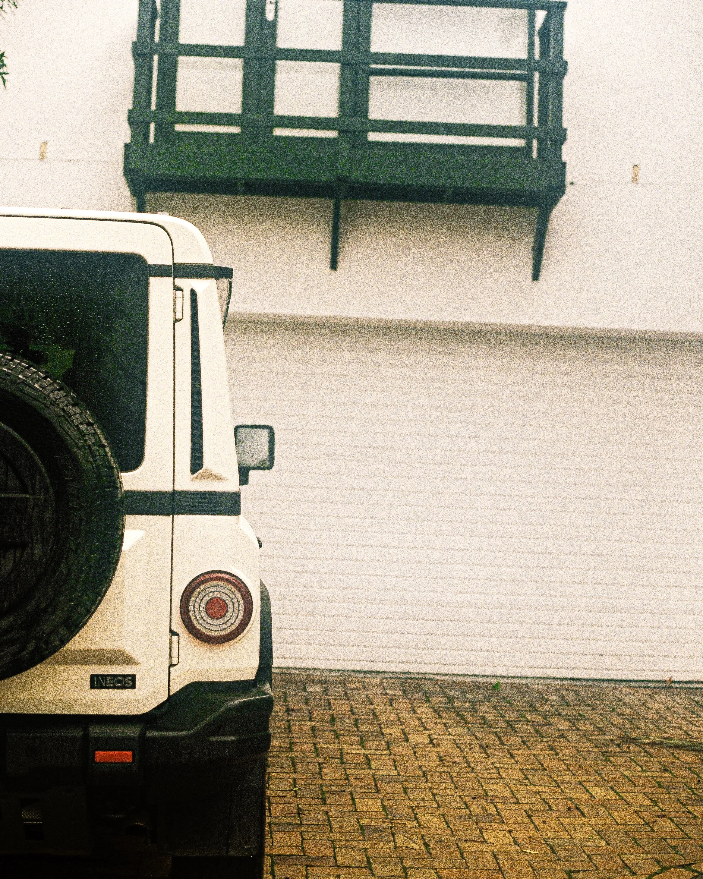 Part of a white off-road vehicle with a spare tire on the back, parked on a brick driveway in front of a white garage door with a green balcony above.