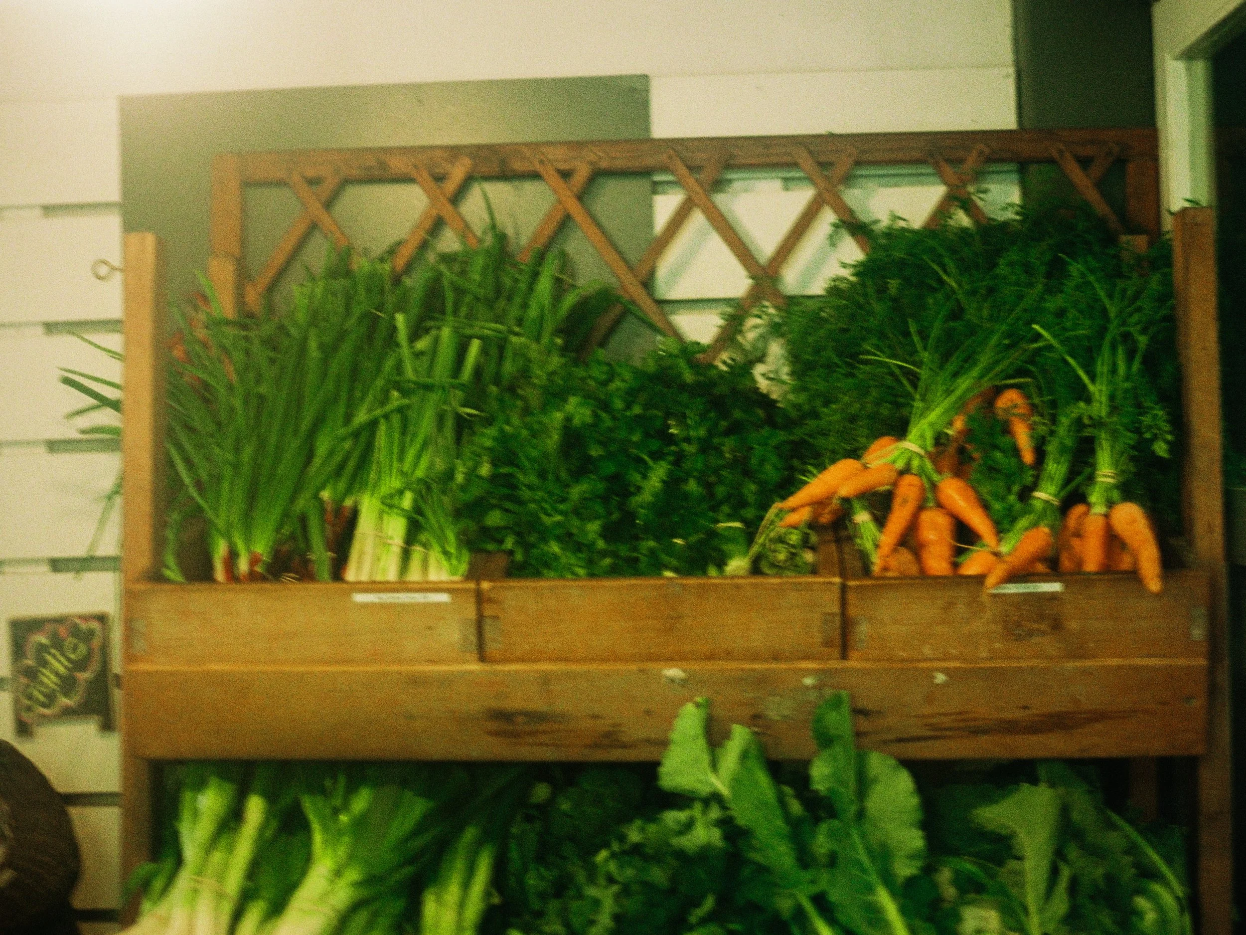 Fresh carrots, green onions, and leafy greens displayed on a wooden shelf in a market or grocery store.