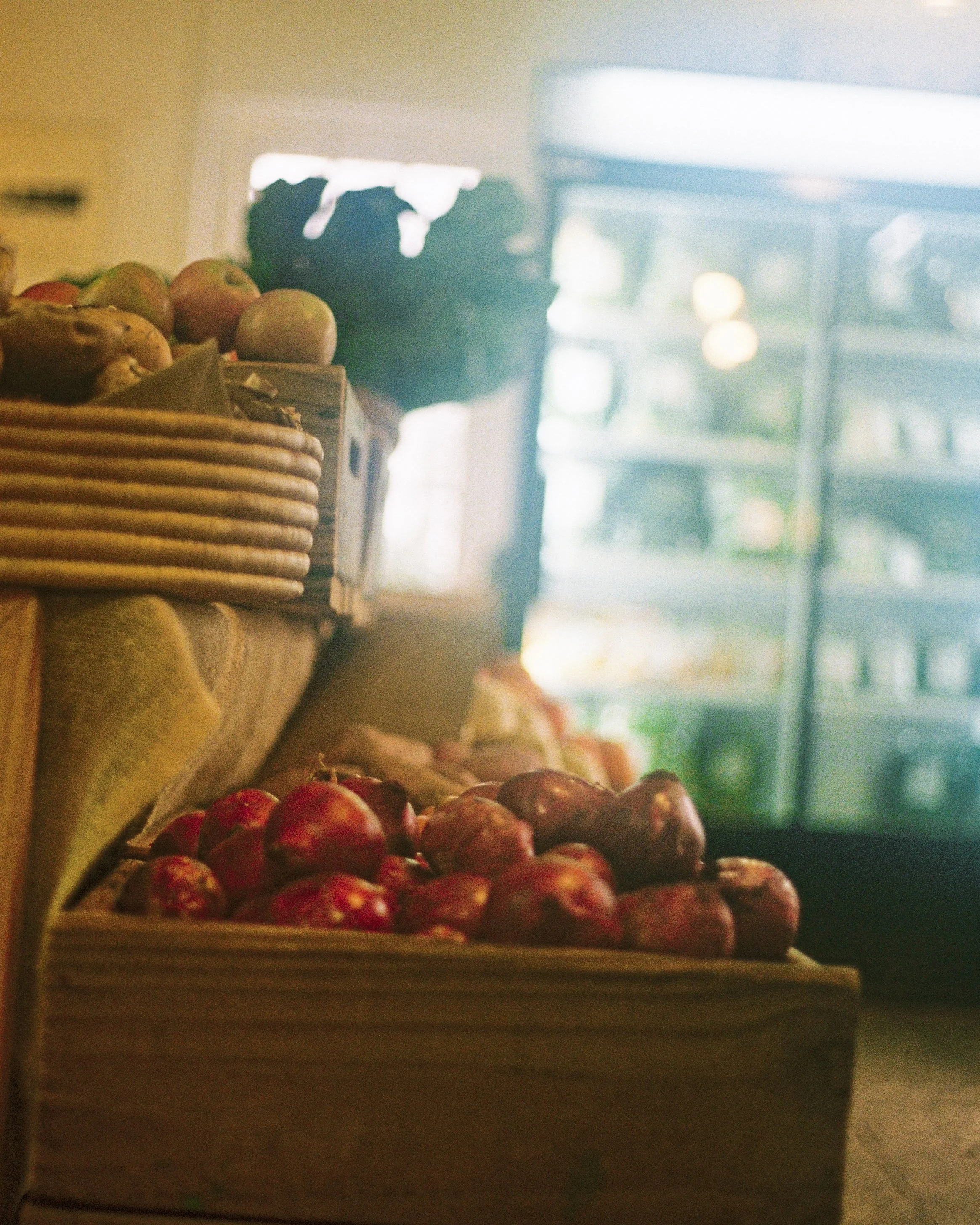 Fresh apples and other fruits displayed in wooden crates in a grocery store with a blurred background of a refrigerator.