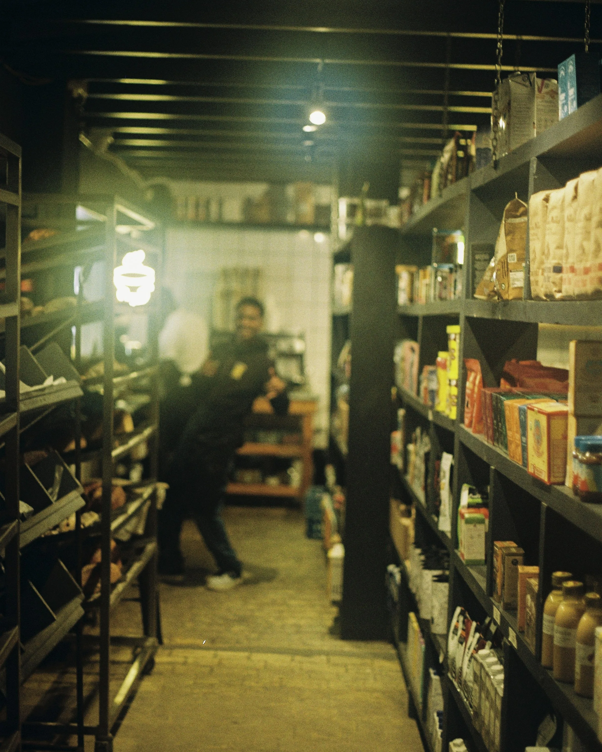 A person is standing in a grocery store aisle, taking a photo with a phone, with shelves stocked with food items on either side.