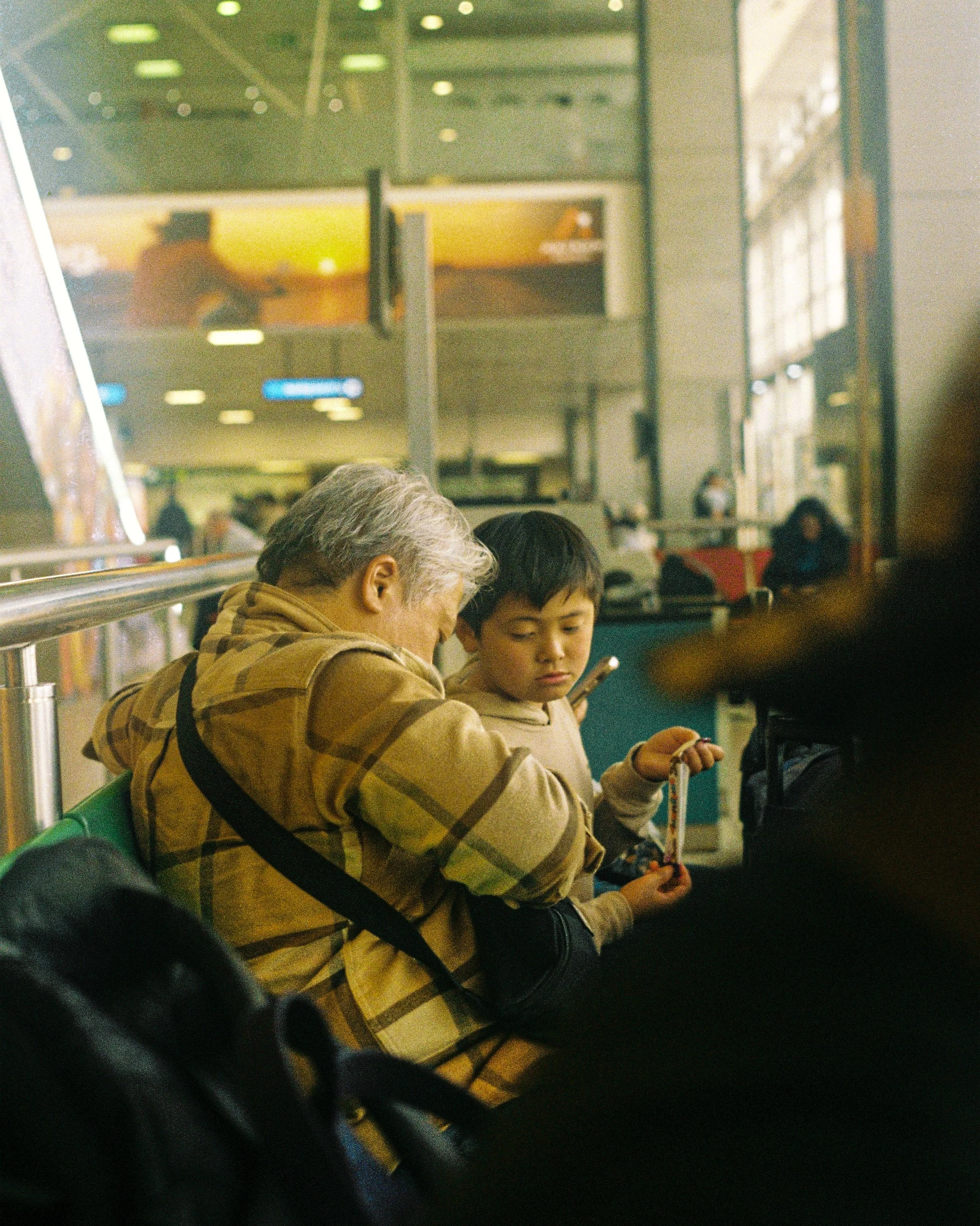 An elderly man and a young boy sitting on a bench at an airport, both looking at their phones.