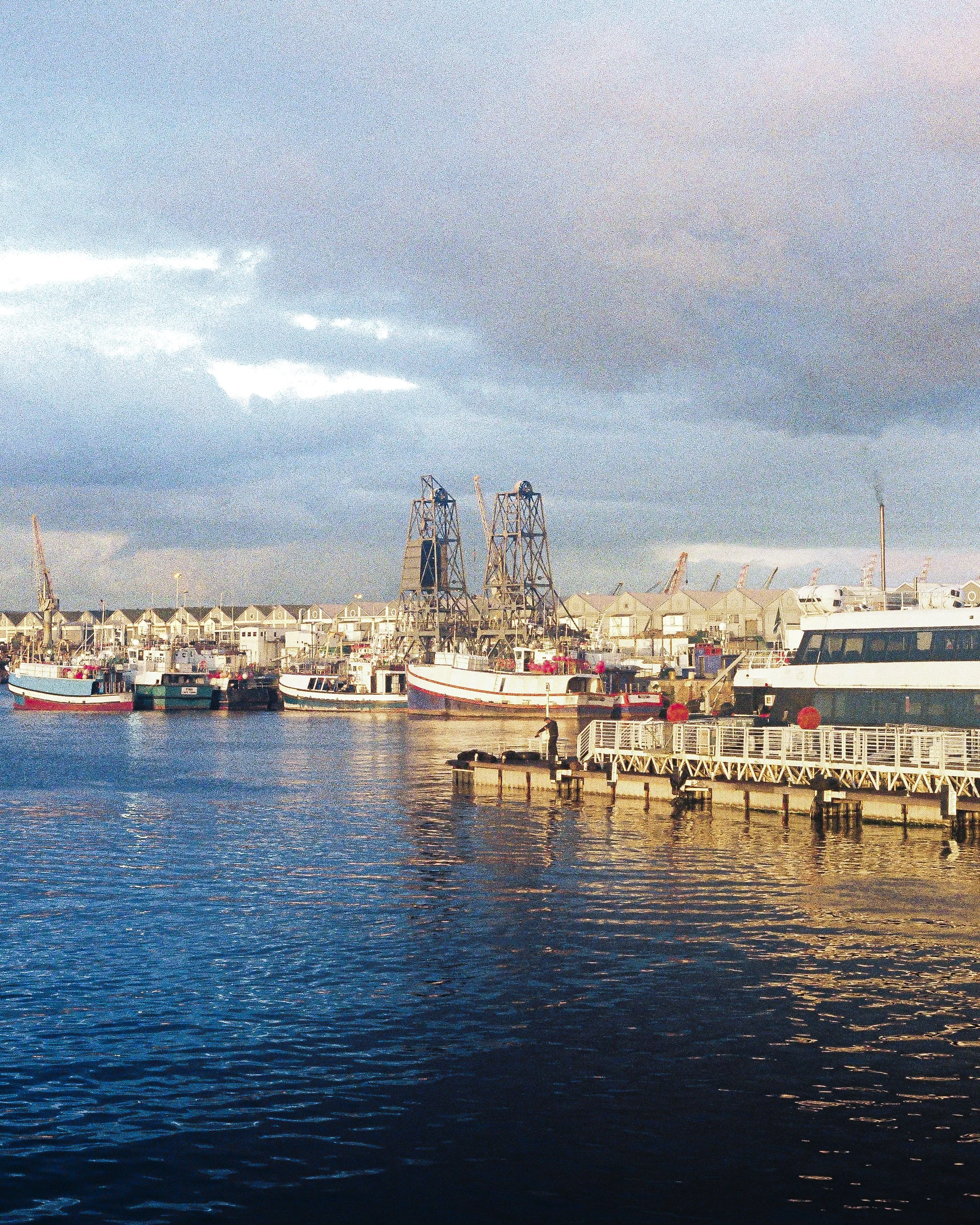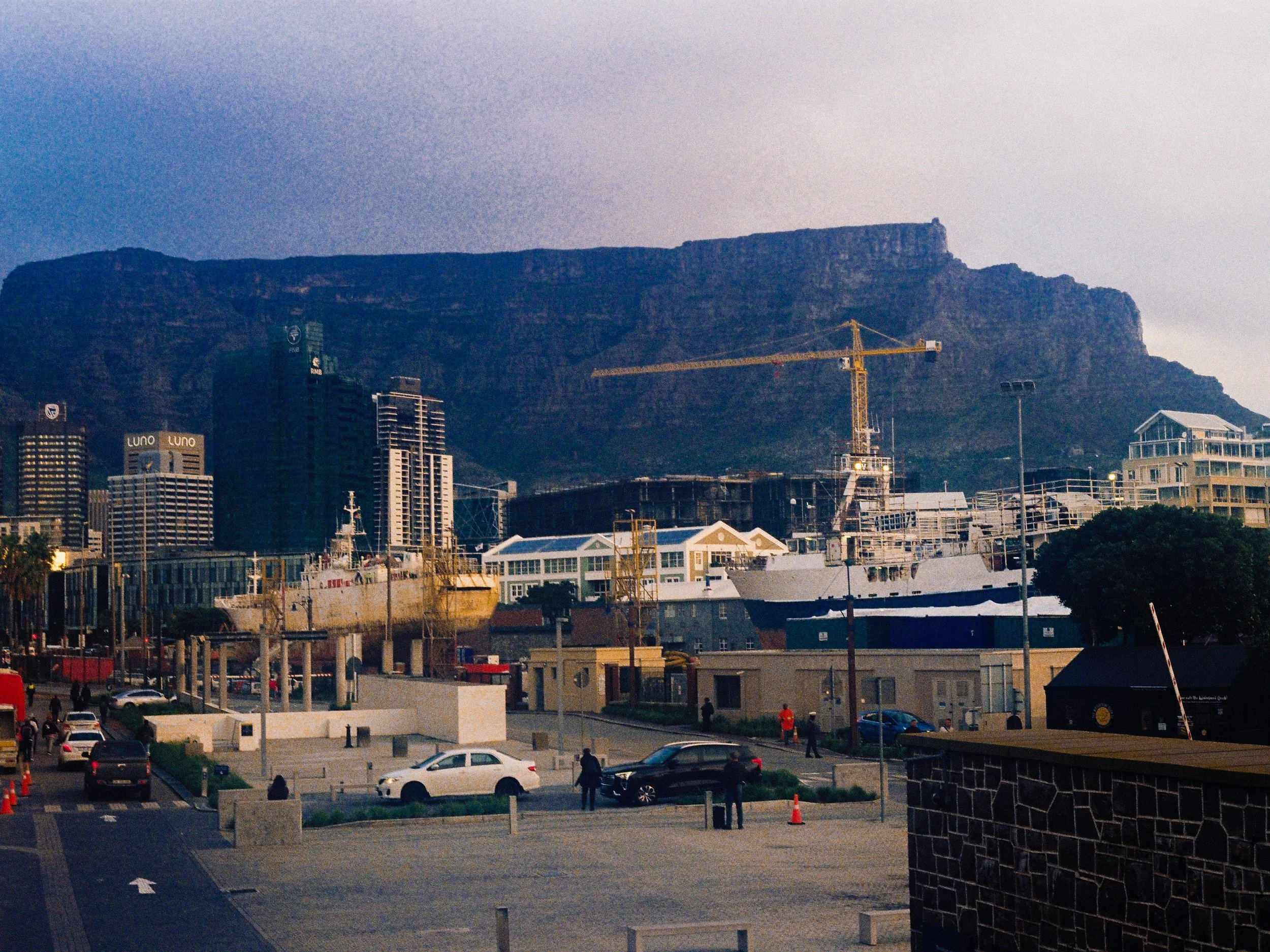 Cityscape featuring high-rise buildings, a construction crane, and ships docked with Table Mountain in the background.