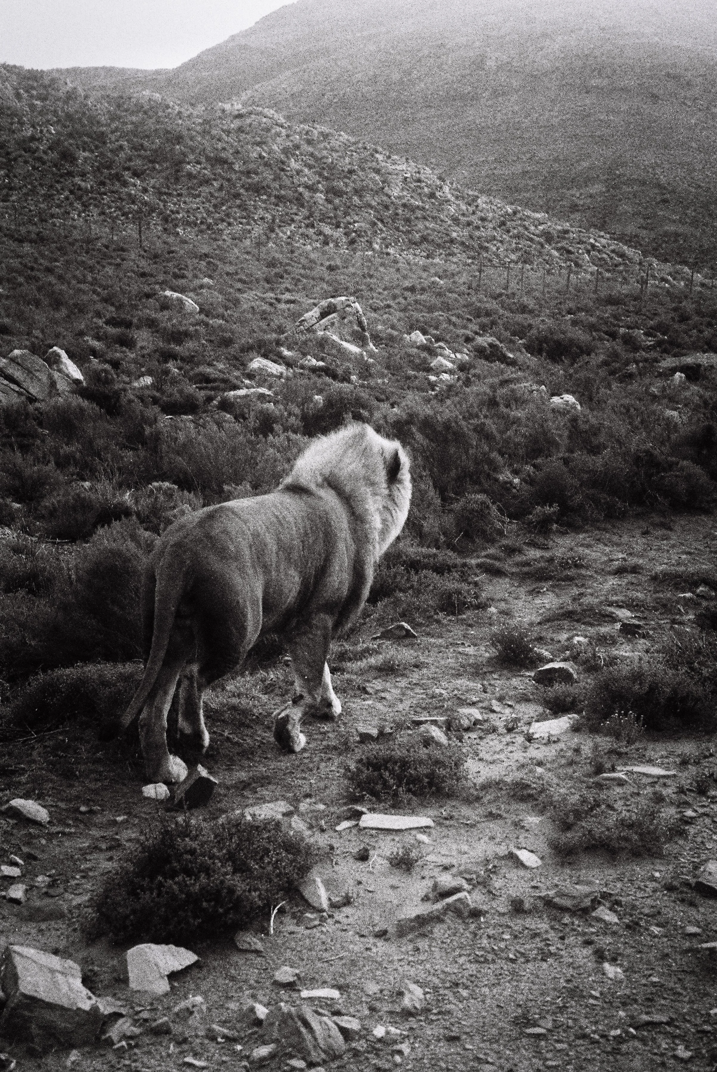 A lion walking on a rocky trail through arid terrain with mountains in the background.