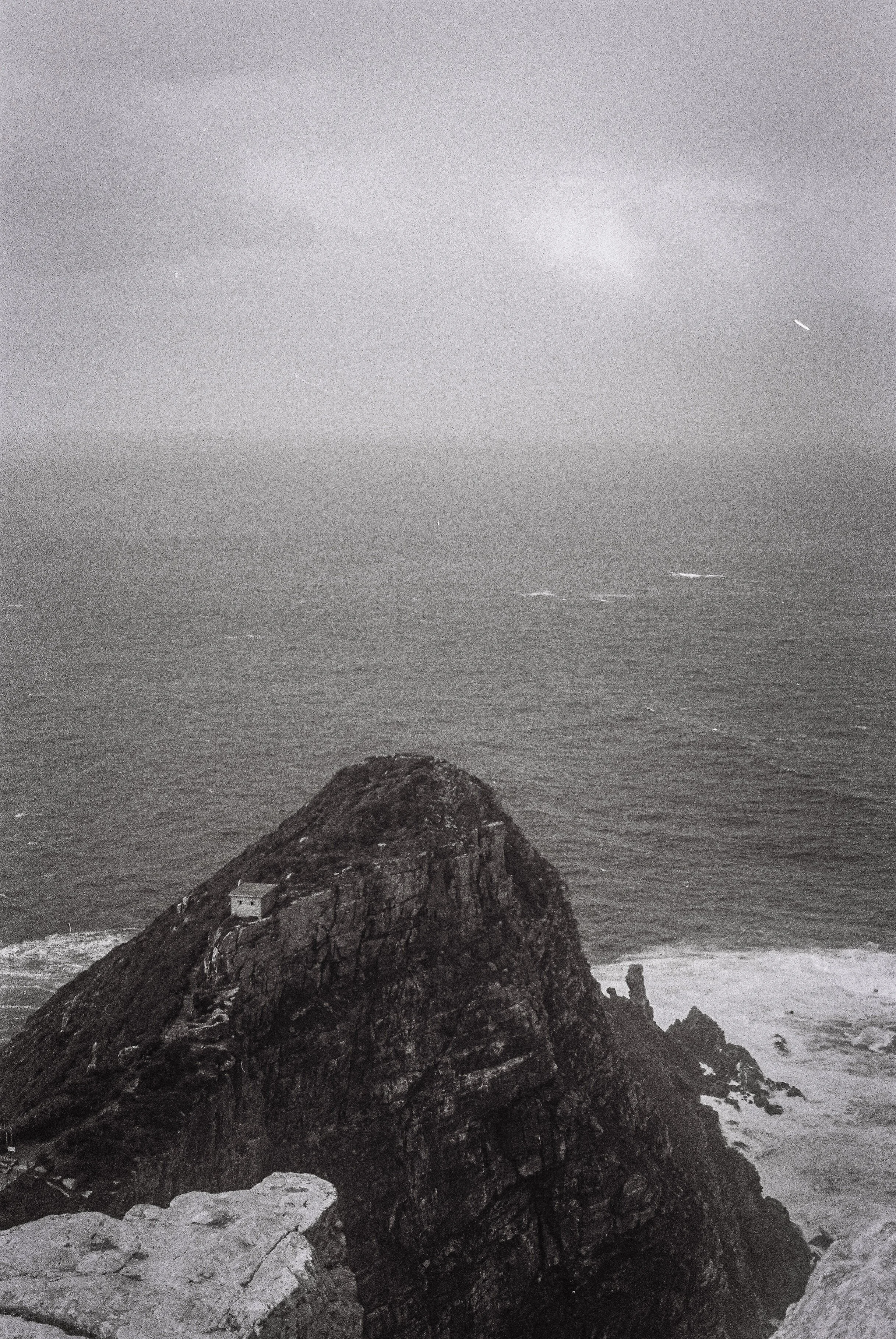 Black and white photo of a rocky hill with a small house on it, overlooking the ocean. The sky is cloudy with a few streaks of light from distant boats or ships.