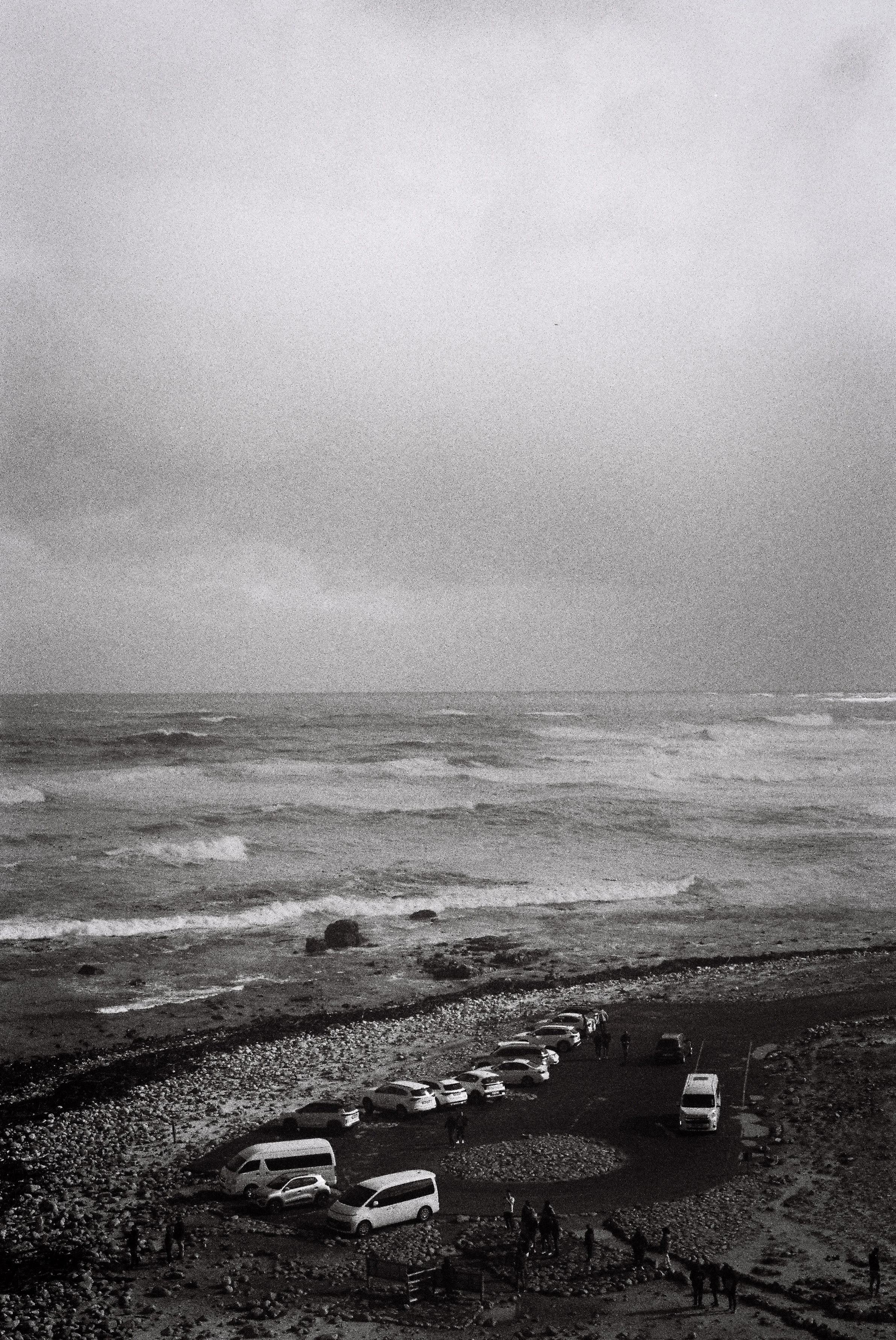 Black and white photo of rugged shoreline with cliffs, waves crashing against rocks, overcast sky, and sparse vegetation in the foreground.
