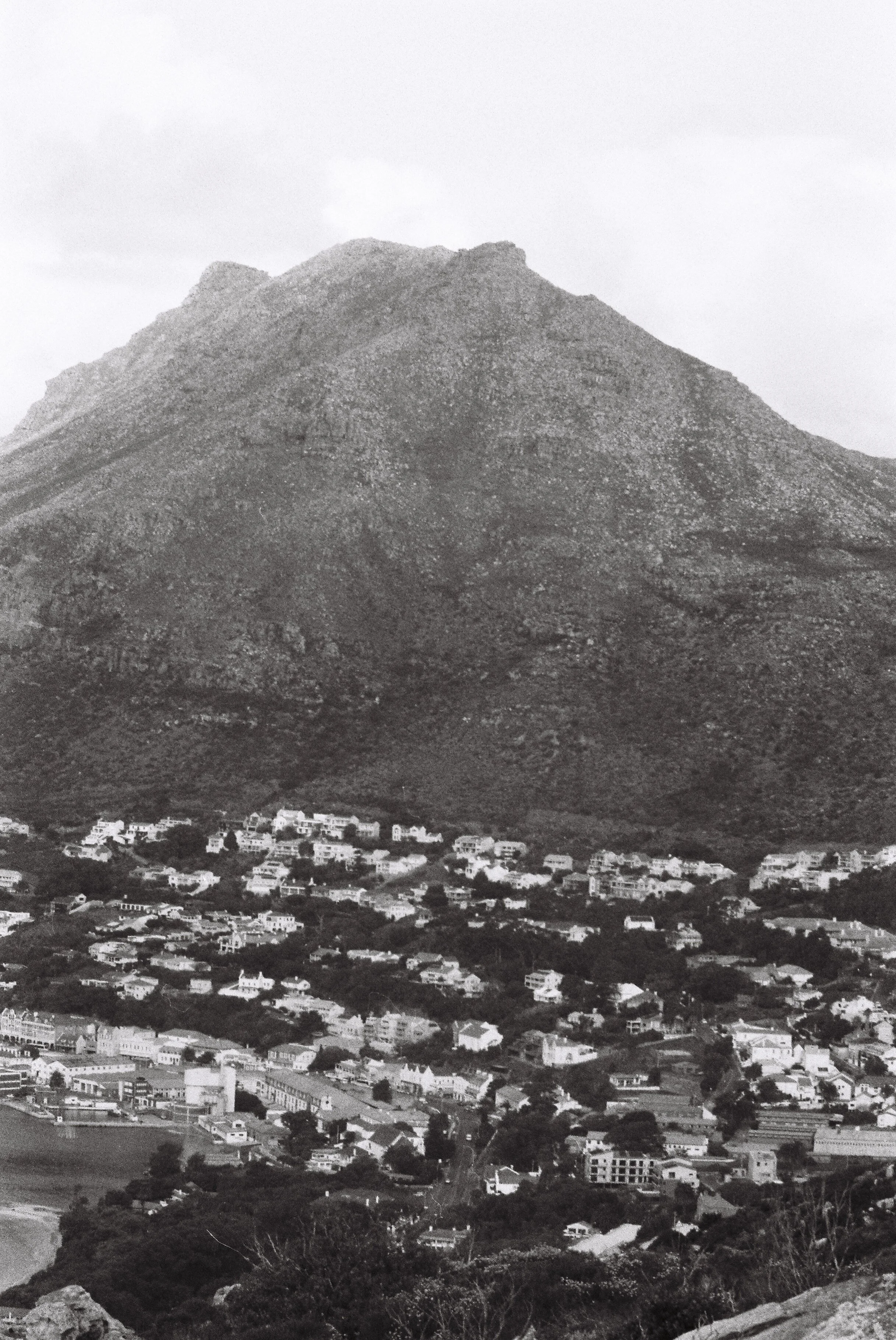 A black and white photograph of a mountain with a small town or village at its base.