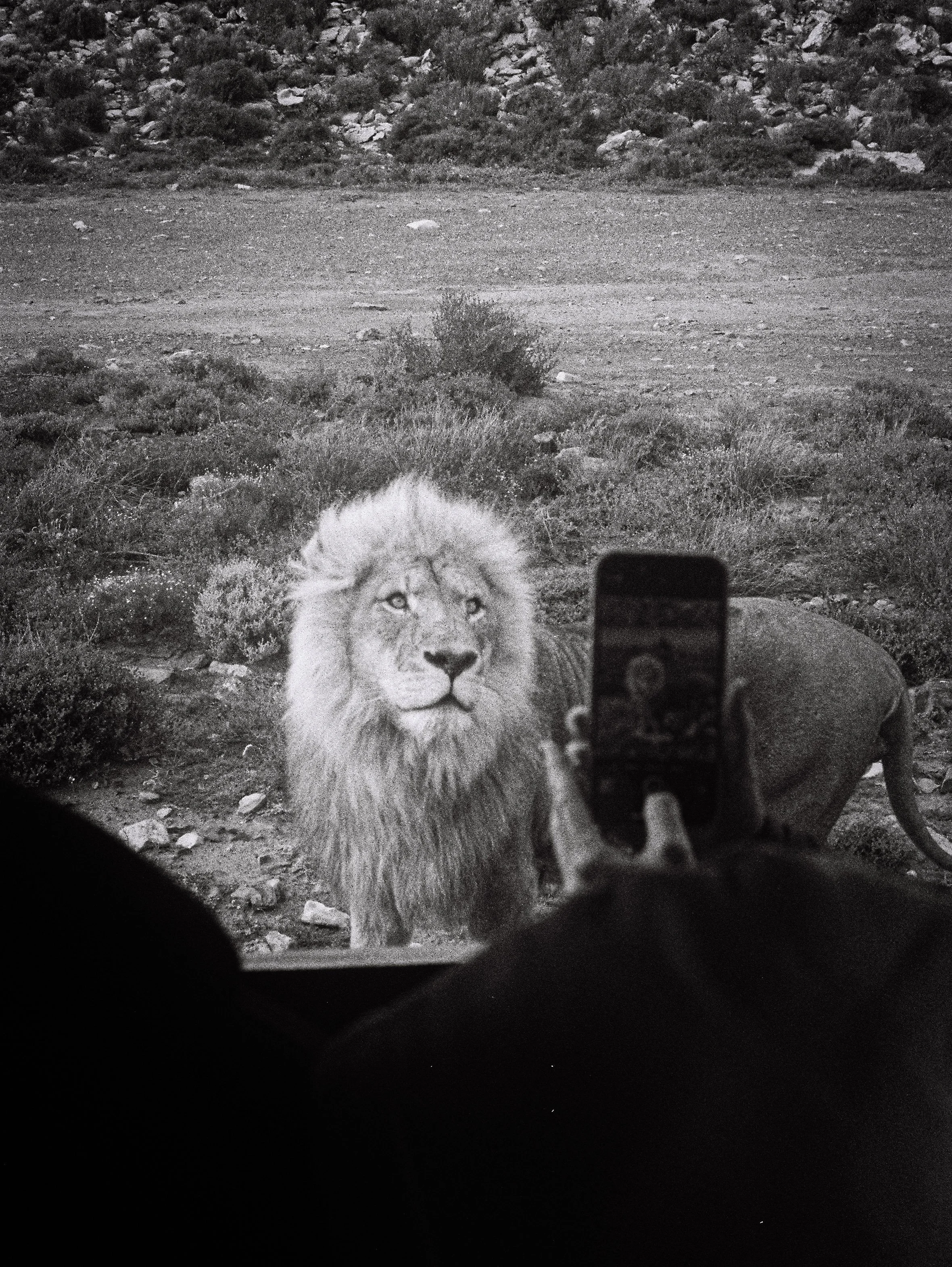 A lion standing outdoors in a natural landscape, with a person taking a photo of it using a smartphone.