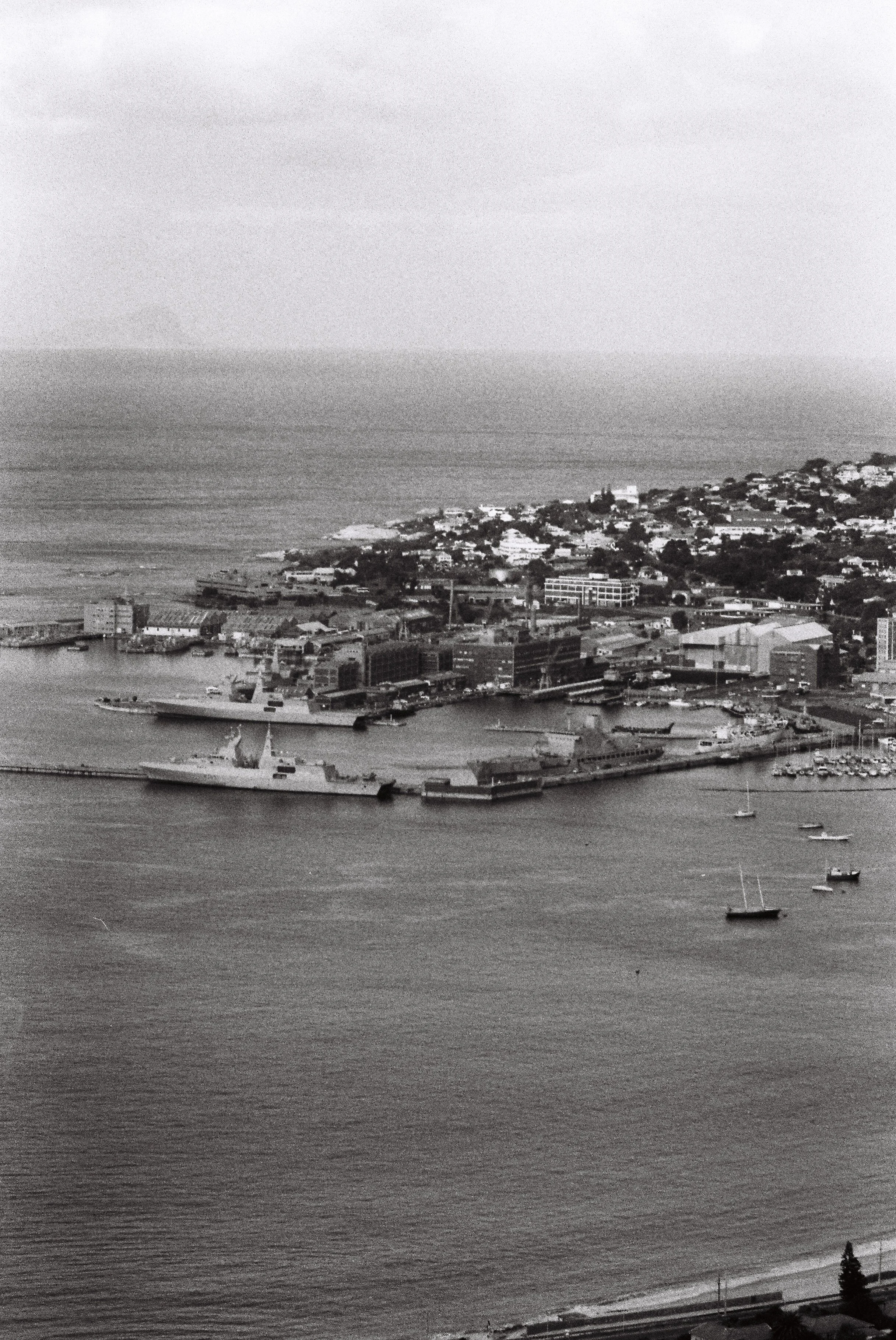 Aerial view of a coastal city with a port, ships, and buildings, with hills and residential areas in the background, in black and white.